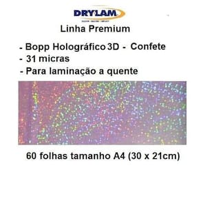 - Marca drylam u.S.A. - linha premium - qualidade sem igual. - o melhor holográfico do mundo. - não tem emendas - não perde os holograma após a aplicação - bopp holográfico - 31 micras - alta espessura - temperatura de aplicação de até 110 graus Conteúdo do kit: as 60 folhas não são cortadas, para um melhor aproveitamento. Vão no tamanho total de 21,5 cm x 18,0 metros o tamanho a4 = 30 x 21 cm Cada 1 folha que enviamos tem 30 x 21,5 cm mais 0,5 cm de sobra Algumas aplicações: - capas de livros, cadernos, cartões de visitas, folders, embalagens e catálogos. - indicado também, para evitar falsificações de ingressos de eventos e fichas que substituem moeda. - maior destaque sobre impressões escuras Dados técnicos: Espessura 31 micras Rendimento: 55,60m/kg Tratamento : 38 dinas/cm Resistência a selagem: 600gf/25mm até 110c Resina: coplímero de polietileno Umedecimento: 42 dinas/cm Marca: Drylam