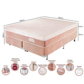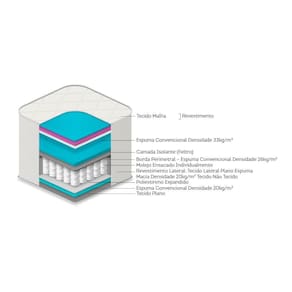 Colchão possui tampo em malha 100% Poliéster Gramatura 440g/m , 7 cm espuma convencional densidade 33kg/m , certificada, fabricação própria, camada isolante (feltro) colado sobre molas ensacadas individualmente de 15cm, poliestireno Expandido de 8cm, Espuma convencional Densidade 20kg/m de 2cm ao fundo tecido plano 100% Poliéster Gramatura 97g/m, e na sua lateral com tecido Veludo Rose 100% Poliéster com toque macio dando mais conforto. Sua Base produzidas por madeira reflorestáveis de eucalipto, com pés de metal de 12cm, revestido em veludo Rosé 100% Poliéster com toque macio.