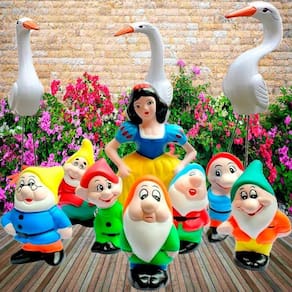 Branca de neve, a bela princesa de nobre coração, é adorada por todas as criaturas do reino, menos uma: a rainha, sua invejosa madrasta. Quando o espelho mágico declara branca de neve como sendo a mais bela de todas, ela foge para a floresta, onde conhece sete adoráveis anões: dunga, mestre, feliz, dengoso, soneca, zangado e atchim. Mas quando a rainha engana branca de neve e a faz morder uma maçã envenenada, somente a magia de um beijo do verdadeiro amor poderá salvá-la. Trio de lindas garças em cerâmica decorativas para decorar a sua casa, varandas, quintais, piscinas, jardins e/ou jardim de inverno. Feitos em cerâmica da melhor qualidade, são pintados artesanalmente com pintura reforçada para suportar sol e chuva com durabilidade. Deixe sua casa e jardim com um clima agradável, alegre e descontraído, sendo também uma ótima opção de presente. Dimensões: - branca de neve grande : altura: 35 cm x largura: 19 cm. - anões: altura: 20 cm x largura: 10 cm Trio de garças em cerâmica: Grande: altura: 40 cm x largura: 10 cm // média: altura: 36 cm x largura: 7 cm // pequena: altura: 34 cm x largura: 7 cm Características do produto: - cerâmica ecológica de alta qualidade com pintura artesanal que suporta sol/chuva em áreas internas e externas. - produzido por artesões profissionais seguindo um padrão de qualidade que atenda o gosto dos nossos clientes Cuidados: - recomendamos o uso de pano levemente umedecido para sua limpeza. Garantia do produto: - o produto é muito bem acomodado dentro da caixa, e super embalado para evitar quebras, ainda assim possuímos um sistema de garantia e troca. Imagens meramente ilustrativas – produto artesanal, podendo variar de cor e/ou tonalidade
