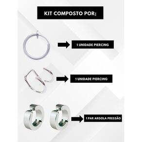 Kit brinco argola pressão prata piercing cartilagem encaixe garra falso aço inox - 4 peças Kit brinco argola pressão prata piercing cartilagem encaixe garra falso aço inox - 4 peças Kit brinco na cor aço inox prata é uma ótima opção para presentear um amigo ou namorado. Esse kit é bem completo, pois contém 2 peça do brinco de cartilagem e 2 peças 1 par do brinco pressão argola. Não precisa ter furo para usar - preço do kit com 4 peças - excelente qualidade ============================================== Fotos reais do produto na galeria Detalhes técnicos: Marca: visujóias Modelo: brinco pressão kit Diâmetro: 8mm Espessura do brinco: 4mm Incluso: 3 peças 2 peças 1 par de argola pressão e 2 peças brinco cartilagem . Material: aço inoxidável. : a tem prazo de 6 meses. Todas as peças possuem tratamento antialérgico. ============================================== P:minha compra é segura R:toda compra que é feita aqui está em ambiente seguro, isso significa que se caso ocorra algum imprevisto faremos o estorno de seu pagamento. R: sim. P: precisa de furo para usar O brinco fica caindo R: não não precisa de furo para usar. Colocando o brinco da maneira correta, não fica caindo, pelo contrario, fica bem fixo. Temos um vídeo na galeria explicando como usar. P: produto é a prova d'água R: sim, pode usar em piscinas e praias que não escurece. P: tem R: sim, todos os nossos produtos tem de 6 meses, contra defeitos de fabricação. Todas as informações de cuidados são enviados junto com o produto. P: posta em quanto tempo P: posso trocar se não servir R: sim, enviamos nosso contato junto com o produto para orientação sobre troca. P: posso devolver se não gostar R: sim, caso não goste do produto é só entrar em contato conosco que iremos orientá-lo como efetuar a devolução. Dúvidas Pergunte à vontade, estamos aqui. ficaremos felizes em responder rapidamente. Aguardamos sua compra e estamos ao seu dispor : Marca: Visujoias