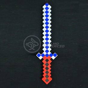 A espada Pixel Minecraft mede 58cm, possui uma luz interna que brilha e um efeito sonoro ao ser acionado o botão existe na espada.