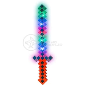 A espada Pixel Minecraft mede 58cm, possui uma luz interna que brilha e um efeito sonoro ao ser acionado o botão existe na espada.