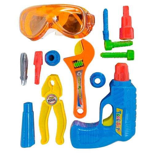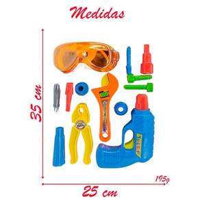 - 01 Óculos de proteção - 01 Furadeira - 01 Chave grifo - 01 Alicate - 01 Chave de fenda - 02 Parafusos + algumas peças