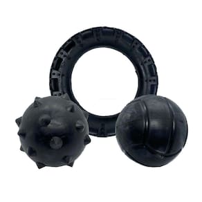 Kit Brinquedos PET Grande Porte Pneu Bola Lisa Cravo Maciço Kit Brinquedo Pet Bola Preta Maciça e Pneu Para Cães de Médio e Grande Porte - Bola Preta Maciça Lisa: 95mm. Maciça;- Bola Preta Maciça Cravo: 95mm. Maciça; - PNEU Grande Preto Maciço: 140mm x 30mm. -brinquedo Maciço NÃO é sonoro não emite nenhum som Benefícios: -distrai e diminui a ansiedade e stress do seu cão, evitando comportamento destrutivo destruir e comer outros objetos . -estimula articulações e músculos da mandíbula. -estimula a pratica de atividades físicas. -diversão garantida entre tutor e seu pet Especificações ver detalhes na foto do anúncio : Material: borracha PVC maciço Cor: Preto Peso APROXIMADO: 350 a 450gr Indicação: cães de médio e grande porte Bulldog Inglês, Boxer, Doberman, Dogue Alemão, São Bernardo, Pitbull, Rottweiler, American Bully, Bull Terrier, Labrador, Pastor-alemão, Golden Retrievere e similares Produto atóxico e de ótima qualidade Observações: -supervisione seu cão durante qualquer tipo de brincadeira. -todo brinquedo é passível de desgaste com o passar do tempo e uso. Substitua-o imediatamente Kit contém:1 Pneu maciço, Tamanho G1 Bola maciça cravo 95 mm.1 Bola maciça lisa 95 mm.