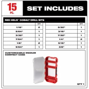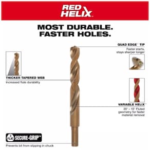 Características:- Tecnologia RED HELIX combina ponta QUAD EDGE, flauta VARIABLE HELIX e web cônica mais espessa. - Ponta QUAD EDGE permanece afiada por mais tempo. - Flauta VARIABLE HELIX projetada para remoção rápida de cavacos.- Design de web cônica mais espessa aumenta a resistência da broca. - Cobalto para 15X mais vida útil do que as brocas de óxido preto. - 3-FLAT SECURE-GRIP evita que a broca escorregue no mandrilProjetado para uso com furadeiras. - Ideal para uso em metais duros, como aço inoxidável, ferro fundido e tubo preto, bem como madeira e plásticos. - Tamanho gravado a laser para fácil identificação. - Estojo de acessórios personalizável projetado para uso em PACKOUT.