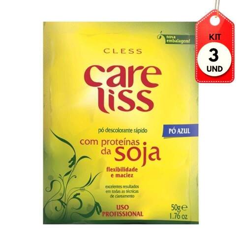 Kit C/03 Care Liss Proteína Da Soja Pó Descolorante 50g DESCRIÇÃO: Clareador. Os ativos de soja garantem fios muitos mais flexíveis e tons que duram por muito mais tempo.AÇÃO/ATIVOS: O pó azul ainda neutraliza o indesejado efeito amarelo. Com uma aplicação rápida e prática, sua exclusiva fórmula não levanta pó (Dust Free), é dermatologicamente testada e suavemente perfumado.MODO DE USAR: Acrescente a medida desejada do Care Liss Pó Descolorante em um recipiente não-metálico e adicione aos poucos o oxidante (vide proporção e oxidante abaixo) e misture com uma espátula não-metálica até formar um creme de consistência homogênea. Faça a PROVA DE TOQUE e TESTE DE MECHA antes de aplicar o produto. Cabelos, utilize 2 ou 3 medidas (a proporção pode variar de acordo com a viscosidade desejada) da Água Oxigenada para 1 de Care Liss Pó Descolorante. A aplicação deverá ser feita sobre os cabelos secos e não lavados, iniciando na nuca ou nas partes mais escuras. Após o tempo de ação, deve-se lavar o cabelo como de costume para retirar totalmente o produto. Deixe agir de 10 a 45 minutos no máximo, conforme o grau de clareamento desejado e a estrutura, porosidade e cor-base dos cabelos. Não se exponha ao sol durante a aplicação. Ao término do tempo de ação, enxágue bem com água morna e lave os cabelos com shampoo e condicionador. Para a intensidade desejada de descoloração, recomendamos o uso das seguintes águas oxigenadas: Tipo de Clareamento Care Liss Água Oxigenada Cremosa: 1 a 2 tons e pêlos do corpo - Água Oxigenada de 10 volumes. 2 a 3 tons- Água Oxigenada de 20 volumes. 3 a 4 tons - Água Oxigenada de 30 volumes. 4 a 6 tons - Água Oxigenada de 40 volumes.ESTE ANÚNCIO CONTÉM: 03 Care Liss Proteína Da Soja Pó Descolorante 50gKit C/03 Care Liss ProteÃna da Soja PÃ Descolorante 50g
