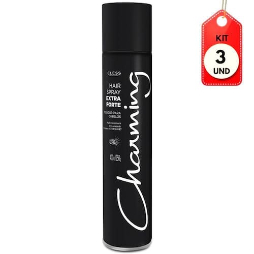 Kit C/03 Charming Black Hair Spray Extra Forte 400ml DESCRIÇÃO: O hair spray Extra Forte jato seco, estiliza, modela e fixa os cabelos, finalizando os penteados e permitindo criar os mais diversos estilos. AÇÃO/ATIVOS: Proporciona ação gradual através de moléculas micro encapsuladas. Promove a recuperação e brilho intenso dos fios. Forma uma película protetora nos fios. Evita a ação do vento e da umidade.MODO DE USAR: Agite bem antes de usar. À uma distância de aproximadamente 20cm, vaporize em todo o comprimento dos cabelos, evitando a raiz.ESTE ANÚNCIO CONTÉM: 03 Charming Black Hair Spray Extra Forte 400mlKit C/03 Charming Black Hair Spray Extra Forte 400ml
