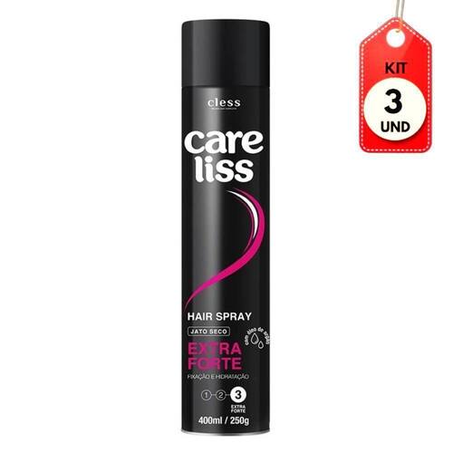 Kit C/03 Cless Care Liss Hair Spray Extra Forte 400ml DESCRIÇÃO: O Hair Spray Care Liss Extra Forte garante fixação de forma eficiente e duradoura para penteados elaborados, mesmo em lugares úmidos.AÇÃO/ATIVOS: Exclusivamente formulado com Óleo de Argan, agente inovador altamente nutritivo, que traz da natureza propriedades que envolve o cabelo por completo, agindo no interior da estrutura. Não pesa nos fios e é rico em vitamina E e ácidos graxos, substâncias indispensáveis à saúde dos cabelos.MODO DE USAR: Agitar antes de usar. Nos cabelos secos, de preferência escovados, vaporizar a superfície dos cabelos com jatos contínuos e uniformes a uma distância de aproximadamente 35cm. Para remover o produto basta escovar ou lavar os cabelos. Proteger os olhos durante a aplicação. Evitar inalar o produto. ANÚNCIO CONTÉM: 03 Care Liss Hair Spray Extra Forte 400mlKit C/03 Cless Care Liss Hair Spray Extra Forte 400ml