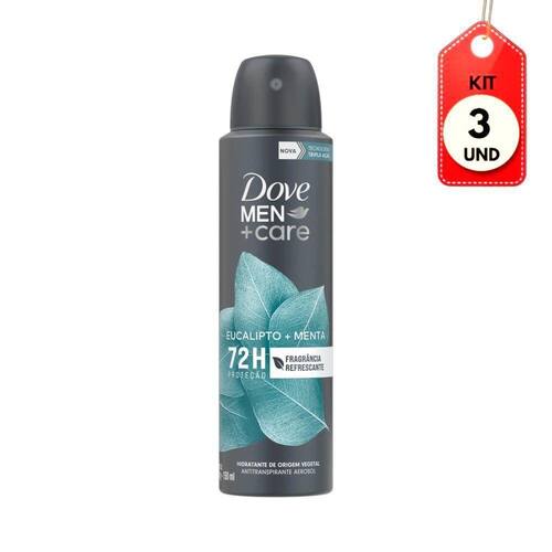 Kit C/03 Dove Men Care Eucalipto E Menta Desodorante Aerosol 150ml DESCRIÇÃO:Desodorante Aerossol Eucalipto + Menta Dove Men Care é um desodorante em aerossol com tecnologia que protege contra o suor e também contra as bactérias causadoras do mau odor. AÇÃO/ATIVOS:Sua fórmula conta com de creme hidratante, além de oferecer potente ação contra o suor, sem irritar e agredir a pele. Potente contra o suor, sem irritar a pele. Oferece 72 horas de proteção. Imagem meramente ilustrativa. O produto pode ter variação de cor ou desenho, porém as características gerais são as mesmas especificadas na descrição do produto.MODO DE USAR:Agite a embalagem antes de usar e aplique um jato de dois segundos em cada axila, mantendo uma distância de 15 centímetros da pele.ESTE KIT CONTÉM: 03 UNIDADES DE DOVE MEN CARE EUCALIPTO E MENTA DESODORANTE AEROSOL 150MLKit C/03 Dove Men Care Eucalipto e Menta Desodorante Aerosol 150ml