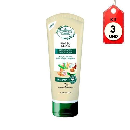 Kit C/03 Flores & Vegetais 5 óleos Máscara Hidratante Reparadora 200g DESCRIÇÃO:Máscara 5 Super Óleos Hidratação Reparadora Flores & Vegetais foi desenvolvida para atender todas as necessidades de diferentes tipos de cabelos. Nutre reparando o fio danificado, devolvendo força e vitalidade aos cabelos fragilizados. AÇÃO/ATIVOS:Sua fórmula foi elaborada a partir da associação de lendários óleos nobres, Abacate, Amêndoas, Coco, Trigo e Jaborandi, que reunidos, auxiliam na retenção da umidade dos fios, proporcionando hidratação, ajudando a combater o ressecamento e controlar o frizz, além de nutrir e reparar o fio. Imagem meramente ilustrativa. O produto pode ter variação de cor ou desenho, porém as características gerais são as mesmas especificadas na descrição do produto.MODO DE USAR:Aplique nos fios lavados e úmidos, deixe agir por 3 minutos, em seguida enxágue bem.ESTE KIT CONTÉM: 03 UNIDADES DE FLORES & VEGETAIS 5 ÓLEOS MÁSCARA HIDRATANTE REPARADORA 200GKit C/03 Flores & Vegetais 5 Ãleos MÃscara Hidratante Reparadora 200g