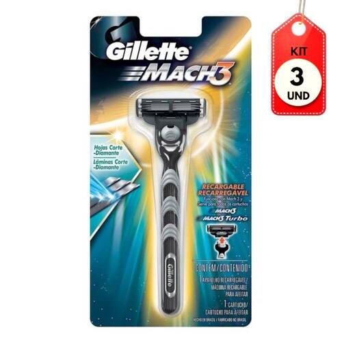 Kit C/03 Gillette Mach3 Aparelho De Barbear Regular C/1 DESCRIÇÃO: Experimente a performance excepcional de mach3 da Gillette, esse aparelho de barbear contém uma fita lubrificante de gel que facilita o deslizar da lâmina e protege a pele contra vermelhidão, ficando esbranquiçada para indicar quando a performance não está mais ótima e chegou a hora de trocar o cartucho.AÇÃO/ATIVOS: A suspensão das lâminas em molas individuais e independentes facilitam um contato rente com a pele e o pivô de ajuste à pressão se adapta aos contornos para um barbear mais prático e confortável, mach3 é melhor que um descartável novo, mesmo após 10 barbas feitas.MODO DE USAR: Aplique o creme de barbear e logo deslize o aparelho sobre o seu corpo.ESTE ANÚNCIO CONTÉM: 03 Gillette Mach3 Aparelho De Barbear Regular C/1Kit C/03 Gillette Mach3 Aparelho de Barbear Regular C/1