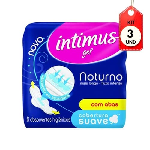 Kit C/03 Intimus Gel Noturno Suave C/abas C/8 Absorvente DESCRIÇÃO: O Absorvente Intimus Noturno Suave com Abas possui sistema centro azul, que aliado às redes de canais, auxiliam na distribuição do fluxo para evitar vazamentos. Além disso, ele possui formato anatômico e proteção noturna maior, deixando sua noite mais tranquila.AÇÃO/ATIVOS: O Absorvente Intimus Noturno Suave com Abas oferece proteção para uma noite tranquila prevenindo vazamentos.MODO DE USAR: Retire a fita central. Fixe o absorvente na calcinha. Retire as fitas das abas, dobre-as para baixo e fixe-as na calcinha.ESTE ANÚNCIO CONTÉM: 03 Unidades de Intimus Gel Noturno Suave C/Abas C/8 AbsorventeKit C/03 Intimus Gel Noturno Suave C/abas C/8 Absorvente