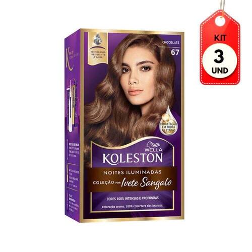 Kit C/03 Koleston Tinta 67 Chocolate DESCRIÇÃO: A Koleston está a cada dia mais realizando o desejo de muitas mulheres que procuram um cabelo com cor intensa e profunda com resultado deslumbrante.AÇÃO/ATIVOS: Suas cores são bonitas e atraentes que penetram facilmente no interior do fio sem danificar-los. Além de promover pigmentos no interior dos cabelos a koleston promove hidratação e nutrição aos fios garantindo brilho, maciez e um toque suave como você sempre quis. Sua textura cremosa preenchem os fios completamente promovendo uma camada de proteção impedindo que a água penetre no fio inibindo o desbotamento indesejado. Resultado de cores duradouras que não saem facilmente. MODO DE USAR: A água oxigenada pode escurecer (volume 10) ou clarear até 4 tons (volume 40) por isso compare a cor do seu cabelo natural com a cor da tinta escolhida. Nas caixinhas de tinta Koleston, você pode encontrar qual é o tom do seu cabelo e qual será o resultado quando você pintar os cabelos. Antes de aplicar a tinta, pegue uma mistura de todos os componentes e passe AM alguma parte do braço. Espere 24 horas até que você tenha certeza que não tenha nenhuma sensibilidade a componentes. Divida os cabelos em cinco partes. Misture o tubo da água oxigenada com o tubo da tinta, até que estejam completamente homogeneizadas. Aplique o sachê pré-coloração que vem junto no tubo de tinta. Esse sachê faz uma pré-hidratação nos fios e melhora a fixação, prevenindo o desbotamento. Depois, com o cabelo ainda separado em mechas, aplique a tinta da raiz até as pontas, se for a primeira vez que você usa a tintura. Caso seja apenas retoque de raiz, aplique a tinta apenas nesse local. Deixe a tinta por 40 minutos, se for a primeira tintura, e por 30 minutos se for a segunda tintura. Se for a primeira tintura, passe um pouco de água fria, deixe por mais 5 minutos e retire com água corrente. Se for retoque de tinta, passe o resto da tinta em todo o cabelo, deixe por 5 minutos e enxágue em seguida. Não é necessário usar shampoo, aplique apenas o condicionador que vem na embalagem.ESTE ANÚNCIO CONTÉM: 03 Koleston Tinta 67 ChocolateKit C/03 Koleston Tinta 67 Chocolate