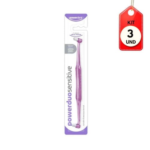 Kit C/03 Powerdent Powerduo Sensitive 2 Tufos Escova Dental DESCRIÇÃO: Power Duo ? Dois Tufos: Possui duas pontas ativas com angulações diferentes para higienização dente a dente.AÇÃO/ATIVOS: Cerdas cuidadosamente arredondadas que limpam de modo suave dentes e gengivas.MODO DE USAR: Escovar os dentes superiores de cima para baixo e os inferiores de baixo para cima, com a escova posicionada num ângulo de 45. Na parte interna dos dentes da frente, a escova deve ficar na vertical. A parte de cima dos molares deve ser escovada em movimento vaivém.ESTE ANÚNCIO CONTÉM: 03 Powerdent Powerduo Sensitive 2 Tufos Escova DentalKit C/03 Powerdent Powerduo Sensitive 2 Tufos Escova Dental
