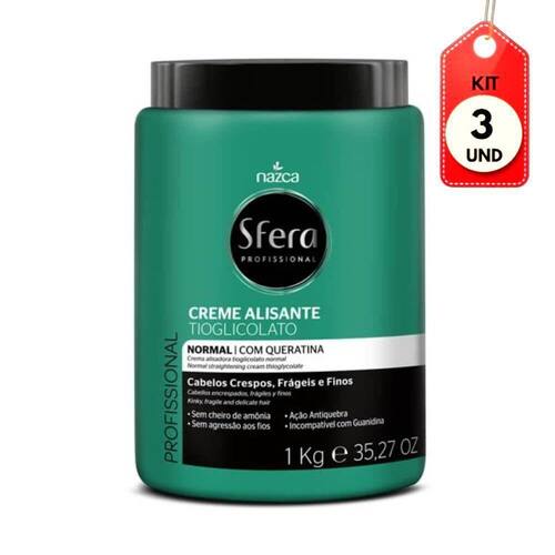 Kit C/03 Sfera Profissional Creme Alisante Forte 1kg DESCRIÇÃO: Essa é a exclusiva formulação da Nazca Cosméticos para Sfera Creme Alisante Forte, sem cheiro de amônia, desenvolvida especialmente para cabelos rebeldes, difíceis de alisar.AÇÃO/ATIVOS: Enriquecida com Queratina proporciona cabelos mais lisos, sem volume e com muito mais brilho.MODO DE USAR: Utilizar conforme indicação do produto.ESTE ANÚNCIO CONTÉM: 03 Sfera Profissional Creme Alisante Forte 1kgKit C/03 Sfera Profissional Creme Alisante Forte 1kg Marca: Sfera Gás