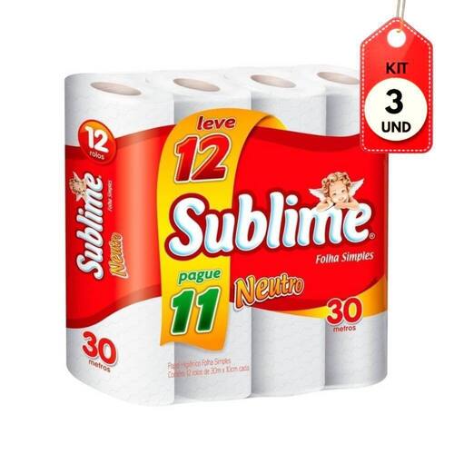Kit C/03 Sublime Papel Higiênico Folha Simples C/12 DESCRIÇÃO:Papel higiênico, da marca sublime, folha simples, pacote leve 12 pague 11 rolos, tendo 30 metros de papel por rolo.AÇÃO/ATIVOS:Sublime é um papel higiênico de alto rendimento para sua família, que combina absorção, maciez e resistência. Fabricado com fibras de áreas de reflorestamento, Sublime está presente na categoria de folha simples e folha dupla, para aqueles que procuram ainda mais maciez e rendimento.MODO DE USAR:Usando o papel higiênico sempre de frente para trás, você evita que os germes presentes nas fezes entrem em contato com sua uretra e causem uma infecção do trato urinário. Ao se limpar, após defecar, o ideal é que a higienização seja feita com água.ESTE ANÚNCIO CONTÉM: 03 UNIDADES DE SUBLIME PAPEL HIGIÊNICO FOLHA SIMPLES C/12Kit C/03 Sublime Papel HigiÃnico Folha Simples C/12