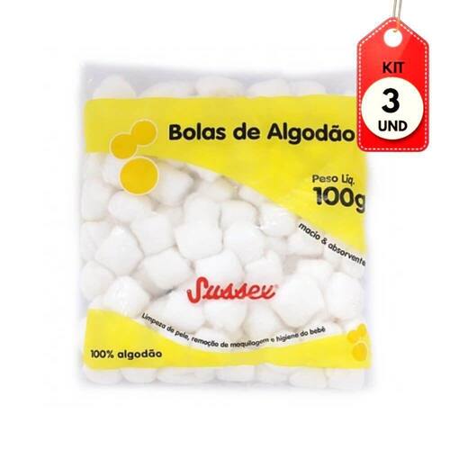 Kit C/03 Sussex Algodão Bolas Branca 100g DESCRIÇÃO: Os Algodões Sussex são indicadas para a limpeza e assepsia da pele, desde as normais até as mais sensíveis como de bebês.AÇÃO/ATIVOS: Composto de fibras 100% algodão, purificadas e alvejadas. Facilita a higienização e assepsia da pele, remoção de maquilagem, esmalte, higiene do bebê, etc.MODO DE USAR: Aplicar no algodão o produto a ser utilizado e espalhar sobre a pele.ESTE ANÚNCIO CONTÉM: 03 Sussex Algodão Bolas Branca 100gKit C/03 Sussex AlgodÃo Bolas Branca 100g