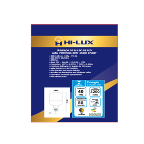 ESPECIFICAÇÕES - Índice de proteção: IP20 - Tensão: Bivolt Automático 100V - 240V - Ângulo de abertura: 220º - IRC**: >80 - Vida útil: 25.000 horas - Potência: 40W - Fluxo luminoso: 3200 lumens - Base: E27 - Temperatura de cor: 6500K (Branca) - Eficiência luminosa: 80lm/W -Dimensão (mm): 118mm x 168mm