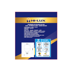ESPECIFICAÇÕES - Índice de proteção: IP20 - Tensão: Bivolt Automático 100V - 240V - Ângulo de abertura: 220º - IRC**: >80 - Vida útil: 25.000 horas - Potência: 40W - Fluxo luminoso: 3200 lumens - Base: E27 - Temperatura de cor: 6500K (Branca) - Eficiência luminosa: 80lm/W -Dimensão (mm): 118mm x 168mm