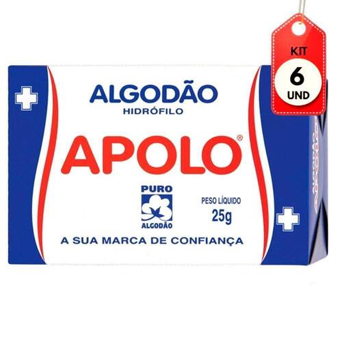 Kit C/06 Apolo Algodão Caixinha 25g DESCRIÇÃO: Produzido a partir de rigorosa seleção de fibras naturais, 100% hidrofilizado, que asseguram qualidade, higiene, maciez e alto poder de absorção de líquidos aquosos e gordurosos.AÇÃO/ATIVOS: Algodão 100% hidrofilo, macio e extra-absorvente. Use na higienização, na aplicação de cosméticos, remoção de maquiagem e esmalte.MODO DE USAR: Aplicar no algodão o produto a ser utilizado e espalhar sobre a pele.ESTE ANÚNCIO CONTÉM: 06 Apolo Algodão Caixinha 25gKit C/06 Apolo AlgodÃo Caixinha 25g