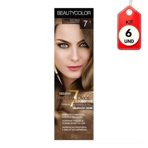 Kit C/06 Beautycolor Tinta Creme 7.1 Louro Natural Acinzentado DESCRIÇÃO: A Coloração Creme Permanente Individual 7.1 Louro Natural Acinzentado Beauty Color restaura e fortalece os fios, promove uma perfeita cobertura dos fios brancos, superior fixação e durabilidade da cor.Uniformiza e intensifica a cor e o brilho quando o cabelo se encontra desbotado e sem brilho, promovendo Hidratação profunda e brilho incomparável. Embalagem Individual para uso cotidianoAÇÃO/ATIVOS: Fórmula enriquecida com Exclusivo Blend de 7 Óleos e BIORESTORE : complexo de aminoácidos essenciais + nutrientes. Garante força, resistência e potencializa a hidratação e brilho dos cabelos garantindo fixação, longa duração da cores e reparação dos fios.MODO DE USAR: Sugestão de Aplicação: 1-Prepare a mistura; 2-Proteja os ombros com uma toalha e a pele com um gel ou creme hidratante; 3-Com a ponta do frasco aplicador, separe pequenas mechas do cabelo e vá aplicando o produto pela raiz, comprimento e pontas; 4-Em seguida, massageie suavemente os cabelos até que o produto esteja distribuído uniformemente; 5-Deixe agir por 20 minutos. Não utilize touca nem prenda o cabelo durante o tempo de ação do produto; 6-Terminando o tempo de ação, enxágue bem até que a água saia limpa. Não é necessária a aplicação de shampoo; 7-Aplique o Creme de Hidratação Profunda Pós Coloração BEAUTYCOLOR, massageie e deixe agir por alguns minutos; 8-Enxágue. Aplique a Gota Intensificadora de Brilho BEAUTYCOLOR, esfregue uma pequena quantidade na palma das mãos e aplique suavemente nos cabelos úmidos ou secos, concentrando o produto nas pontas. Não enxágue.ESTE ANÚNCIO CONTÉM: 06 Beautycolor Tinta Creme 7.1 Louro Natural AcinzentadoKit C/06 Beautycolor Tinta Creme 7.1 Louro Natural Acinzentado