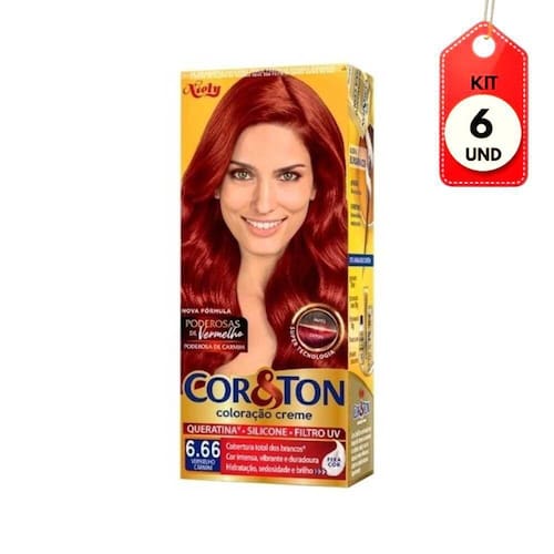 Kit C/06 Cor & Ton Tinta Especial 6.66 Louro Escuro Vermelho 50g DESCRIÇÃO: É uma coloração permanente com fórmula de altíssima qualidade. Proporciona aos cabelos cores vivas, luminosas e duradouras. Total cobertura dos fios brancos. Hidratação, sedosidade e brilho.AÇÃO/ATIVOS: Com queratina, gérmen de trigo, silicone e filtro UV que garantem cabelos fortes, nutridos e com máxima proteção. Com textura cremosa, facilita a distribuição nos fios, fazendo com que os pigmentos sejam facilmente absorvidos.MODO DE USAR: Utilizar conforme indicado na embalagem.ESTE ANÚNCIO CONTÉM: 06 Cor & Ton Tinta Especial 6.66 Louro Escuro Vermelho 50gKit C/06 Cor & Ton Tinta Especial 6.66 Louro Escuro Vermelho 50g