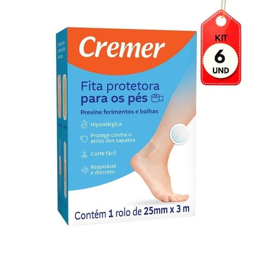 Kit C/06 Cremer Fita Protetora P/ Pés 2,5cmx3m DESCRIÇÃO: A fita Protetora para os Pés Cremer é ideal para aplicar nos dedos, calcanhares e laterais dos pés que estão em atrito constante com calçados.AÇÃO/ATIVOS: Discreta, flexível, resistente e impermeável. A fita Protetora para os Pés Cremer protege a pele prevenindo bolhas, cortes, rachaduras e arranhões. Hipoalérgica - Protege contra o atrito dos sapatos - Corte fácil: você define o tamanho - Transparente e discreta.MODO DE USAR: Limpar bem o ferimento antes de aplicar o produto. Trocá-lo sempre que a almofada estiver úmidaESTE ANÚNCIO CONTÉM: 06 Cremer Fita Protetora P/ Pés 2,5cmx3mKit C/06 Cremer Fita Protetora P/ PÃs 2,5cmx3m