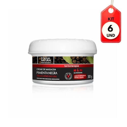 Kit C/06 D água Pimenta Negra Creme Para Massagem 300g DESCRIÇÃO:O Creme de Massagem Pimenta Negra 300g D agua Natural auxilia na ativação do sistema linfático promovendo aumento da circulação e do metabolismo. AÇÃO/ATIVOS:Sendo um forte aliado para redução de medidas e celulite. Recomendado para ser utilizado nos dias de frio, pois promove um efeito prolongado mantendo o corpo com sensação térmica mais elevada durante um tempo.MODO DE USAR:Aplicar o creme esfoliante nos pés, massageando suavemente em movimentos circulares até obter a esfoliação desejada. Enxague com água em abundância até retirar completamente os resíduos. Usar de uma a duas vezes por semana.ESTE ANÚNCIO CONTÉM: 06 UNIDADES DE D ÁGUA PIMENTA NEGRA CREME PARA MASSAGEM 300GKit C/06 D Ãgua Pimenta Negra Creme para Massagem 300g