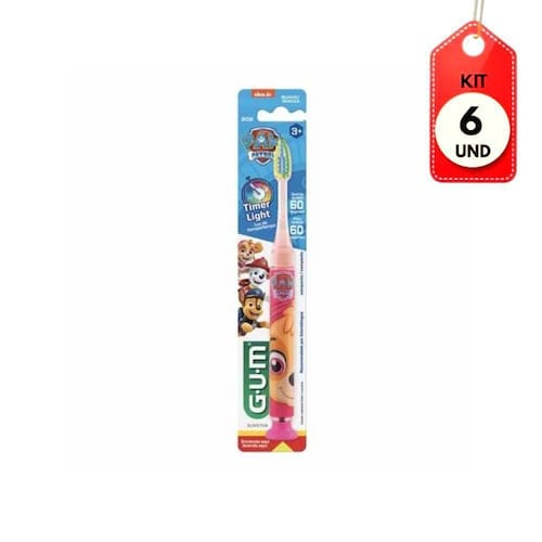 Kit C/06 Gum Timer Light Patrulha Canina Escova Dental Infantil DESCRIÇÃO:É uma maneira brilhante e colorida de educar seu filho sobre a importância de escovar duas vezes ao dia, evitando o acúmulo de placa dentária e os alicerces de uma boca saudável.AÇÃO/ATIVOS:A escova fica ligada por um minuto para ensinar as crianças A escovar por mais tempo.- A ventosa na base facilita o armazenamento da escova e mantém as cerdas limpas.- cerdas maciasMODO DE USAR:Após as principais refeições, molhe a escova e aplique pasta de dente sobre as cerdas, molhe novamente e escove os dentes por pelo menos 2 minutos.Escove toda a arcada superior e inferior, sempre em movimentos suaves. Seu uso diário é altamente recomendável para manter a saúde bucal, sem dificuldades.ESTE ANÚNCIO CONTÉM: 06 UNIDADES DE GUM TIMER LIGHT PATRULHA CANINA ESCOVA DENTAL INFANTILKit C/06 Gum Timer Light Patrulha Canina Escova Dental Infantil