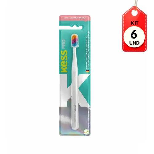 Kit C/06 Kess Pro Colorful Escova Dental Extra Macia DESCRIÇÃO:Maior número de cerdas que garantem limpeza profunda dos dentes.Cerdas extra macias e ultrafinas de material especial que oferecem mais conforto na escovação, são gentis com a gengiva.Cabo reto com cabeça angulada.? Capa protetora de cerdas. AÇÃO/ATIVOS:Seu formato com cerdas pequenas e arredondadas não permite que as gengivas sejam machucadas.Além de facilitar a eliminação da placa bacteriana entre os dentes e a região da gengiva, evitando o mau hálito, a escova também oferece higiene bucal completa e eficiente. MODO DE USAR:Segure a escova em um ângulo de 45 graus e escove com movimentos que vão da gengiva à ponta dos dentes. ESTE ANÚNCIO CONTÉM: 06 UNIDADES DE KESS PRO COLORFUL ESCOVA DENTAL EXTRA MACIAKit C/06 Kess Pro Colorful Escova Dental Extra Macia