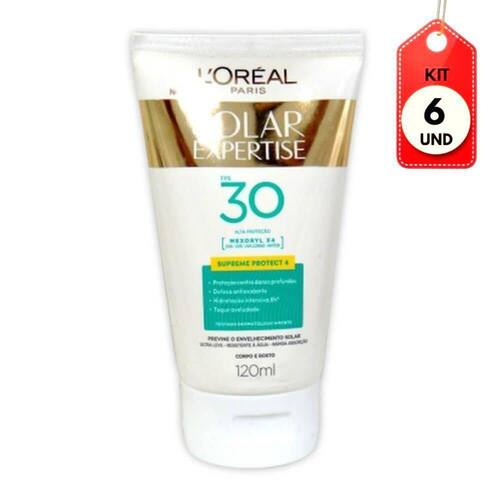 Kit C/06 Loreal Protetor Solar Expertise Fps30 120ml DESCRIÇÃO: Protetor Solar L?oréal Expertise Supreme Protect proteção reforçada contra os raios solares uva, uvb, uva Longo e defesa antioxidante que ajuda a reduzir os danos causados pela radiação infravermelha.AÇÃO/ATIVOS: Em uma fórmula ultra leve e com alto poder hidratante. Pele radiante, com uma cor visivelmente saudável, hidratada e protegida contra as agressões do sol.MODO DE USAR: Utilizar conforme indicado na embalagem.ESTE ANÚNCIO CONTÉM: 06 Loreal Protetor Solar Expertise Fps30 120mlKit C/06 Loreal Protetor Solar Expertise Fps30 120ml