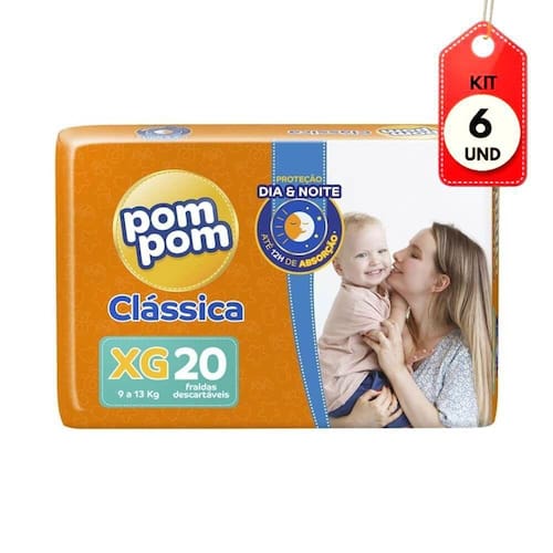 Kit C/06 Pom Pom Clássica Fralda Infantil Jumbo Xg C/20 DESCRIÇÃO:Fralda Descartável Clássica Pom Pom conta com canais super absorventes e gel que absorve o líquido duas vezes mais rápido, assim, você terá mais tranquilidade sabrendo que seu bebê está protegido o tempo todo. AÇÃO/ATIVOS:Desenvolvida com exclusiva tecnologia que não deixa a fralda pesar e cair, protege por até 12 horas de absorção, mantendo a pele do bebê sempre sequinha. Além disso, possui barreiras que evitam vazamentos e abas elásticas que proporcionam maior conforto e ajuste a cintura do seu bebê. Imagem meramente ilustrativa. O produto pode ter variação de cor ou desenho, porém as características gerais são as mesmas especificadas na descrição do produto.MODO DE USAR:Coloque a fralda limpa e aberta debaixo do bumbum do bebê, ajustando para ficar centralizada, descole as fitas ajustáveis e fixe-as sobre a parte frontal da falda, ajustando de acordo com o corpinho do bebê. ESTE KIT CONTÉM: 06 UNIDADES DE POM POM CLASSICA FRALDA INFANTIL JUMBO XG C/20Kit C/06 Pom Pom ClÃssica Fralda Infantil Jumbo Xg C/20