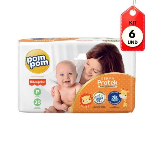 Kit C/06 Pom Pom Derma Protek Fralda Infantil Jumbo P C/30 DESCRIÇÃO:Nova Pom Pom Derma Protek oferece a máxima proteção e cuidado continuo para pele delicada do seu bebê: além da alta performance e segurança contra vazamentos, sua nova fórmula ajuda a prevenir as irritações da pele do bebê deixando-a mais hidratada e protegida. Imagem meramente ilustrativa. O produto pode ter variação de cor ou desenho, porém as características gerais são as mesmas especificadas na descrição do produto.AÇÃO/ATIVOS:Contém loção hidratante com extratos naturais que hidratam e protegem auxiliando na prevenção de irritação da pele do bebê. Canal superabsorvente que garante a pele do seu bebê sequinha 2x mais rápido; Benefício do uso contínuo: quanto mais o bebê usar a fralda Pom Pom Derma Protek mais hidratada sua pele ficará. MODO DE USAR:Colocar uma fralda limpa e aberta debaixo do bumbum do bebê; Colocar um creme para assadura, caso seja necessário. Ou seja, caso a região do bumbum ou das virilhas se encontro com vermelhidão; Fechar a fralda fixando ambos os lados com as fitas adesivas, deixando-a por baixo do coto umbilical, caso o bebê ainda o tenha;ESTE KIT CONTÉM: 06 UNIDADES DE POM POM DERMA PROTEK FRALDA INFANTIL JUMBO P C/30Kit C/06 Pom Pom Derma Protek Fralda Infantil Jumbo P C/30