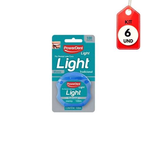 Kit C/06 Powerdent Light Fio Dental Tradicional 100m DESCRIÇÃO:Estojo transparente que informa antecipadamente o término do produto.AÇÃO/ATIVOS:Fio Dental Power Dent Light - 100M - ibra de monocabos de polipropileno torcidos que garante resistência a ruptura.Impregnado com cera Microcristalina, Cristais de Menta e Edulcorante.Desliza com facilidade. Possui baixo grau de desfiamento.MODO DE USAR:Passe entre os dentes suavementeESTE ANÚNCIO CONTÉM: 06 UNIDADES DE POWERDENT LIGHT FIO DENTAL TRADICIONAL 100MKit C/06 Powerdent Light Fio Dental Tradicional 100m
