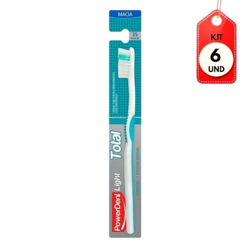 Kit C/06 Powerdent Light Total 35 Escova Dental Macia DESCRIÇÃO: Cabeça compacta e arredondada com 39 tufos. 6580 cerdas ultramacias em Pbt fabricadas na Alemanha. As pontas das cerdas são arredondadas para proporcionar o máximo conforto na escovação.AÇÃO/ATIVOS: A embalagem contém um exclusivo suporte para manter a escova em pé ou deitada, e um protetor de cerdas para mantê-las sempre higienizadas.MODO DE USAR: Utilizar para higienização bucal.ESTE ANÚNCIO CONTÉM: 06 Powerdent Light Total 35 Escova Dental MaciaKit C/06 Powerdent Light Total 35 Escova Dental Macia