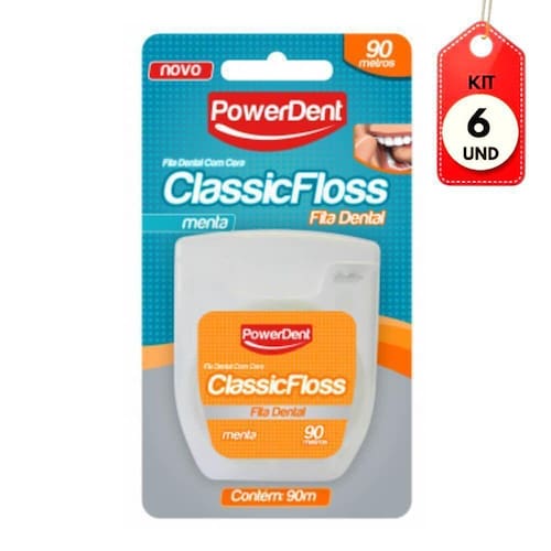 Kit C/06 Powerdent Power Classic Fita Dental 90m DESCRIÇÃO: FITA CLASSIC 90M. AÇÃO/ATIVOS: Fibra de monocabos de polipropileno torcidos que garante resistência a ruptura.Impregnado com cera Microcristalina, Cristais de Menta e Edulcorante.Fibra mais larga que proporciona maior eficácia na higienização entre os dentes.Desliza com facilidade. Possui baixo grau de desfiamento.Estojo transparente que informa antecipadamente o término do produto.MODO DE USAR: Enrole aproximadamente 40 centímetros do fio ao redor de cada dedo médio, deixando uns dez centímetros entre os dedos.Segurando o fio dental entre o polegar e indicador das duas mãos, deslize-o levemente para cima e para baixo entre os dentes.Passe cuidadosamente o fio ao redor da base de cada dente, ultrapassando a linha de junção do dente com a gengiva. Nunca force o fio contra a gengiva, pois ele pode cortar ou machucar o frágil tecido gengival.Utilize uma parte nova do pedaço de fio dental para cada dente a ser limpo.Para remover o fio, use movimentos de trás para frente, retirando-o do meio dos dentes.ESTE ANÚNCIO CONTÉM: 06 Powerdent Power Classic Fita Dental 90mKit C/06 Powerdent Power Classic Fita Dental 90m