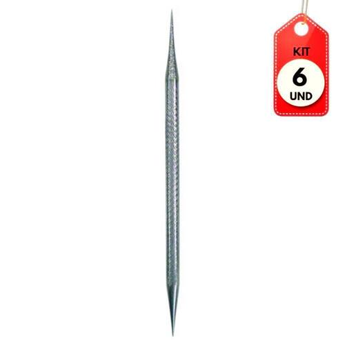 DESCRIÇÃO:Possui um lado polido para retirada de excesso do esmalte e pequenos retoques e outro afiado, com ranhuras para o uso do algodão. A textura do cabo facilita o manuseio do instrumento dando mais precisão e segurança aos movimentos. Imagem meramente ilustrativa. O produto pode ter variação de cor ou desenho, porém as características gerais são as mesmas especificadas na descrição do produto.AÇÃO/ATIVOS:Auxiliar o profissional na aplicação do esmalte.MODO DE USAR:Para uso pessoal, podólogos e manicures profissional.ESTE KIT CONTÉM: 06 UNIDADES DE RICCA INOX PALITO DE UNHAKit C/06 Ricca Inox Palito de Unha