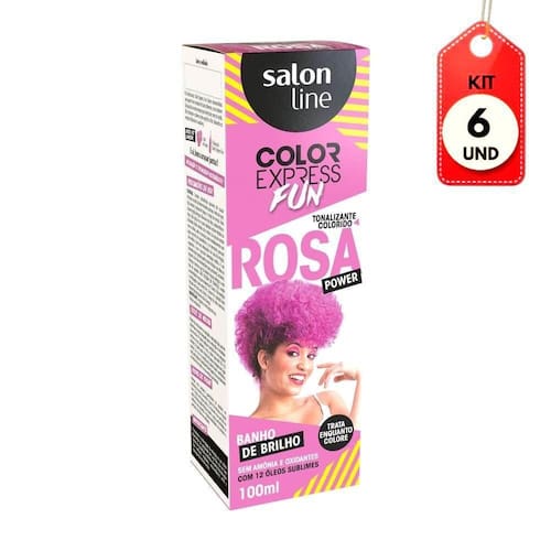 Kit C/06 Salon Line Color Express Tonalizante Rosa Power DESCRIÇÃO:O Tonalizante da Salon Line Color Express Fun Rosa Power foi desenvolvido para quem não abre mão de cores vibrantes e de uma coloração que hidrata o cabelo e não agride os fios. Color Express Fun é Tonalizante sem amônia. Imagem meramente ilustrativa. O produto pode ter variação de cor ou desenho, porém as características gerais são as mesmas especificadas na descrição do produto.AÇÃO/ATIVOS:A formulação do Tonalizante Rosa Power Color Express Fun conta com um mix de 12 óleos - óleo de argan, karité, semente e algodão, macadâmia, chá-verde, camomila, aloe vera, cálamo, mirra, oliva e canela que promove hidratação e nutrição capilar, além de devolver o brilho e a luminosidade dos cabelos.MODO DE USAR:Com os cabelos limpos e úmidos, aplique o Tonalizante Rosa Power ao longo dos fios descoloridos. Aguarde entre 30 e 50 minutos - o tempo varia de acordo com a porosidade do cabelo e a intensidade desejada. Enxágue bem com água em abundância até retirar todo o excesso de produto.ESTE KIT CONTÉM: 06 UNIDADES DE SALON LINE COLOR EXPRESS TONALIZANTE ROSA POWER Kit C/06 Salon Line Color Express Tonalizante Rosa Power