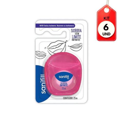 Kit C/06 Sanifill Infinite Fio Dental 25mt DESCRIÇÃO:O Fio Dental Sanifill Infinite, feito com fio de PTFE, foi desenvolvido especialmente para deslizar mais facilmente entre os dentes, promovendo uma limpeza super confortável. Imagem meramente ilustrativa. O produto pode ter variação de cor ou desenho, porém as características gerais são as mesmas especificadas na descrição do produto.AÇÃO/ATIVOS:O Fio Dental Condor Menta remove os resíduos dos alimentos que ficam entre os dentes, é fácil e muito prático para usar.MODO DE USAR:Enrole aproximadamente 40 centímetros do fio ao redor de cada dedo médio, deixando uns dez centímetros entre os dedos. Segurando o fio dental entre o polegar e indicador das duas mãos, deslize-o levemente para cima e para baixo entre os dentes. Passe cuidadosamente o fio ao redor da base de cada dente, ultrapassando a linha de junção do dente com a gengiva. Nunca force o fio contra a gengiva, pois ele pode cortar ou machucar o frágil tecido gengival. Utilize uma parte nova do pedaço de fio dental para cada dente a ser limpo. Para remover o fio, use movimentos de trás para frente, retirando-o do meio dos dentes.ESTE KIT CONTÉM: 06 UNIDADES DE SANIFILL INFINITE FIO DENTAL 25MTKit C/06 Sanifill Infinite Fio Dental 25mt