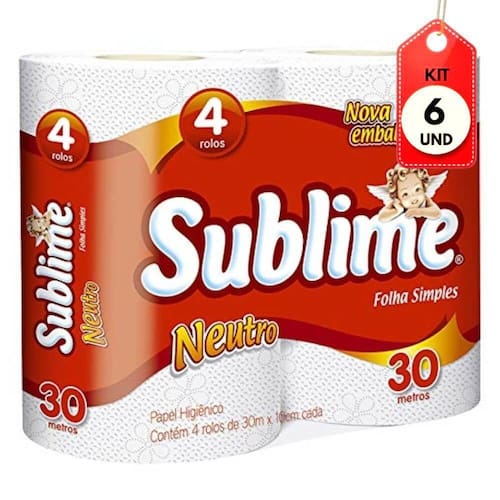 Kit C/06 Sublime Neutro Folha Simples Papel Higiênico C/4 DESCRIÇÃO:Papel higiênico, da marca sublime, folha simples, pacote com 4 rolos, tendo 30 metros de papel por rolo. Imagem meramente ilustrativa. O produto pode ter variação de cor ou desenho, porém as características gerais são as mesmas especificadas na descrição do produto.AÇÃO/ATIVOS:Suave, resistente; Absorção; Rende muito mais.MODO DE USAR:Mais informações via embalagem.ESTE KIT CONTÉM: 06 UNIDADES DE SUBLIME NEUTRO FOLHA SIMPLES PAPEL HIGIENICO C/4Kit C/06 Sublime Neutro Folha Simples Papel HigiÃnico C/4