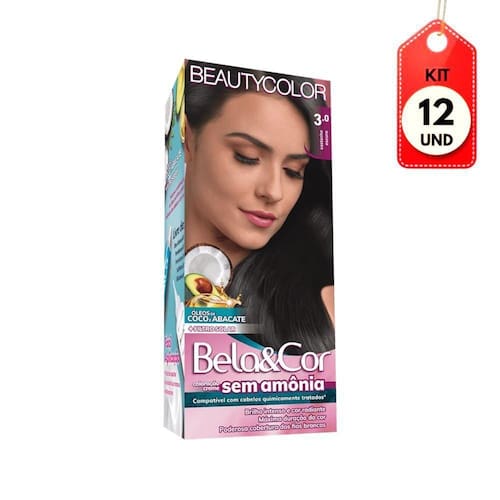 Kit C/12 Bela & Cor 3.0 Castanho Escuro S/ Amônia DESCRIÇÃO:Tintura Bela&Color sem Amônia 3.0 Castanho Escuro BeautyColor resulta em cores vibrantes e luminosos e, melhor ainda, não contém amônia em sua composição.AÇÃO/ATIVOS:Formulado com pigmentos inovadores que penetram profundamente os fios cobrindo 100% dos fios brancos e deixando com um acabamento perfeito, além de uma cor radiante e duradoura deixa seus fios mais hidratados e brilhantes. Imagem meramente ilustrativa. O produto pode ter variação de cor ou desenho, porém as características gerais são as mesmas especificadas na descrição do produto.MODO DE USAR:Coloque as luvas. Despeje aos poucos o conteúdo da bisnaga da Coloração Creme BEAUTYCOLOR dentro do frasco aplicador da Emulsão Reveladora e agite alternadamente até obter uma mistura cremosa e homogênea. Proteja os ombros com uma toalha e a pele com um gel ou creme hidratante, divida os cabelos em mechas. Comece a aplicação, mecha por mecha, pela raiz. Utilize o bico aplicador para facilitar a aplicação. Nuances até 10.0, deixe agir por 15 minutos. Nuances acima de 10.11, deixe agir por 20 minutos. Terminado o tempo de ação, enxague bem até que a água saia limpa. Aplique o Creme de Hidratação Profunda Pós Coloração BEAUTYCOLOR, massageie e deixe agir por alguns minutos. Enxague. Aplique o Intensificador de Brilho BEAUTYCOLOR seguindo as instruções abaixo.ESTE ANÚNCIO CONTÉM: 12 UNIDADES DE BELA&COR 3.0 CASTANHO ESCURO S/ AMÔNIAKit C/12 Bela & Cor 3.0 Castanho Escuro S/ AmÃnia