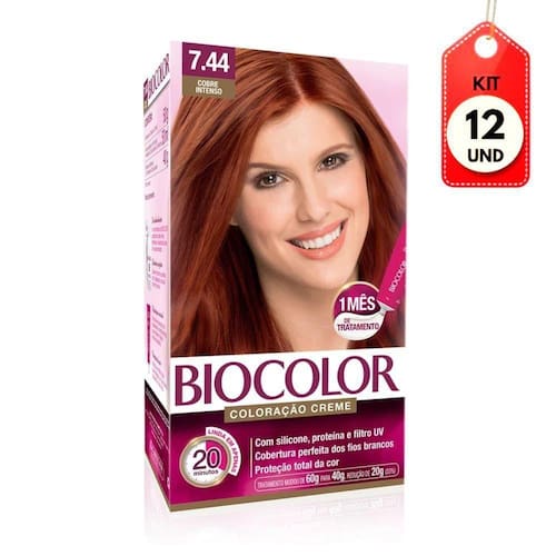 Kit C/12 Biocolor 7.44 Louro Acobreado Mini Kit DESCRIÇÃO:Tintura Mini 7.44 Louro Acobreado Biocolor é ideal para quem deseja colorir os cabelos de maneira simples, rápida e prática.AÇÃO/ATIVOS:Age em apenas 20 minutos e tem fragrância suave devido à uma tecnologia que reduz o cheiro da amônia, tornando a aplicação muito mais agradável. Inclui no kit uma loção reveladora, a coloração e o tratamento condicionante para uma semana. Imagem meramente ilustrativa. O produto pode ter variação de cor ou desenho, porém as características gerais são as mesmas especificadas na descrição do produto. MODO DE USAR:Coloque as luvas. Divida o cabelo em 4 partes. Separe pequenas mechas. Inicie a aplicação pela frente, siga para trás e depois para as pontas, distribua o produto de maneira uniforme até que todo o cabelo esteja coberto pela coloração. Deixe agir por 20 minutos. Enxágue abundantemente até que a água fique totalmente transparente, lave os cabelos com shampoo. Aplique a máscara em todo o comprimento dos cabelos, massageie e deixe agir por 3 minutos. Enxágue e finalize como desejar.ESTE ANÚNCIO CONTÉM: 12 UNIDADES DE BIOCOLOR 7.44 LOURO ACOBREADO MINI KITKit C/12 Biocolor 7.44 Louro Acobreado Mini Kit