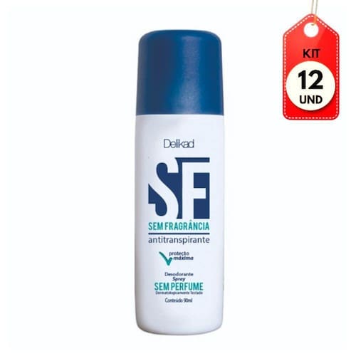 Kit C/12 Delikad Sf S/ Perfume Desodorante Spray 90ml DESCRIÇÃO:O Desodorante Antitranspirante Spray Delikad SF é um clássico em versão líquida, de fácil aplicação, e proporciona até 48h de proteção, além ser dermatologicamente testado, assim como todos os produtos Delikad SF. Imagem meramente ilustrativa. O produto pode ter variação de cor ou desenho, porém as características gerais são as mesmas especificadas na descrição do produto.AÇÃO/ATIVOS:SF, a nova linha sem fragrância de Delikad que proporciona proteção da transpiração. Com SF a proteção é garantida, mas não há mistura ou competição com outras fragrâncias do seu cotidiano. Uma linha para todos, para ser usada por quem quiser. SF, sua proteção antitranspirante sem perfumação! MODO DE USAR:Agite bem a embalagem antes de usar. Faça uma aplicação curta, mantendo uma distância mínima de 15cm da pele. O spray não deve se prolongar - cerca de 2 segundos em cada axila são suficientes.ESTE KIT CONTÉM: 12 UNIDADES DE DELIKAD SF S/ PERFUME DESODORANTE SPRAY 90MLKit C/12 Delikad Sf S/ Perfume Desodorante Spray 90ml