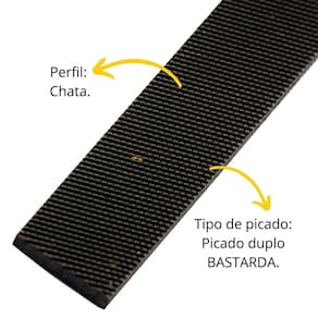 Descrição: Possui picado duplo e corte grosso que proporciona maior desbaste. Indicação: Indicada para desbastar metais em superfícies planas. Dureza: 58-62 HRC. Comprimento: 10" - 250mm. Cabo: Não. Perfil: Chata. Tipo de picado: Picado duplo - BASTARDA.