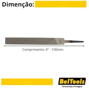 Lima chata bastarda 4" / 100mm - Beltools Possui picado duplo e corte grosso que proporciona maior desbaste. Indicação: Indicada para desbastar metais em superfícies planas. Dureza: 58-62 HRC. Comprimento: 4" - 100mm. Cabo: Não. Perfil: Chata. Tipo de picado: Picado duplo - BASTARDA.
