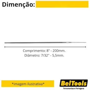 Possui formato redondo com dentes construídos especialmente para proporcionar melhor operação de afiação. Indicação: Indicada para afiar correntes de motosserra. Dureza: 58-62 HRC. Comprimento: 8" - 200mm. Diâmetro: 7/32" - 5,5mm. Cabo: Sem cabo. Perfil: Redonda. Tipo de picado: Picado simples.