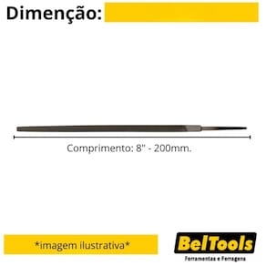 Descrição: Possui picado duplo e corte grosso que proporciona maior desbaste. Indicação: Indicada para desbastar metais com superfícies planas, ranhuras, cantos e rasgos de chaveta. Dureza: 58-62 HRC. Comprimento: 8" - 200mm. Cabo: Sem cabo. Perfil: Quadrada. Tipo de picado: Picado duplo - BASTARDA