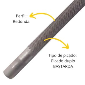 Descrição: Possui picado duplo e corte grosso que proporciona maior desbaste. Indicação: Indicada para desbastar metais com superfícies côncavas, aberturas circulares ou furos. Também conhecida como limatão. Dureza: 58-62 HRC. Comprimento: 6" - 150mm. Cabo: Sem cabo. Perfil: Redonda. Tipo de picado: Picado duplo - BASTARDA