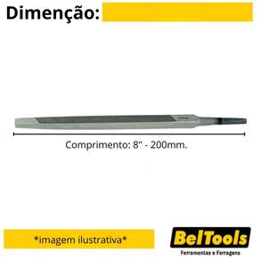 Descrição: Possui picado duplo e corte grosso que proporciona maior desbaste. Indicação: Indicada para desbastar metais com superfícies angulares internas e cantos de ângulos retos. Dureza: 58-62 HRC. Comprimento: 8" - 200mm. Cabo: Sem cabo. Perfil: Triangular Tipo de picado: Picado duplo - BASTARDA
