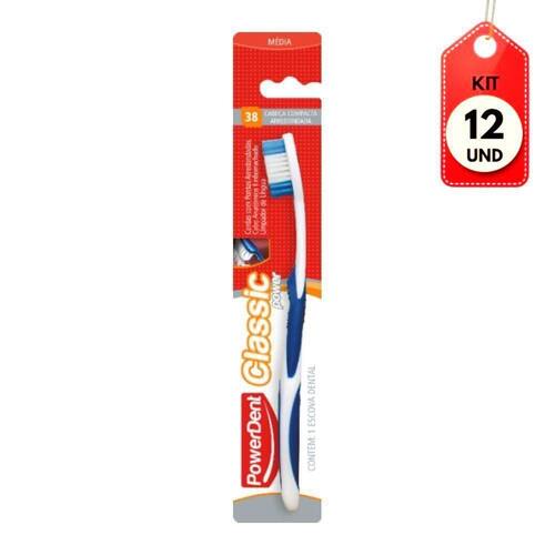 Kit C/12 Powerdent 1332 Classic Power Escova Dental Média DESCRIÇÃO: ESCOVA CLASSIC POWER. Embalagem com 1 unidade MÉDIA.AÇÃO/ATIVOS: Cabeça oval contendo 38 tufos dispostos de forma compacta e raspador de língua. Cerdas com pontas cuidadosamente arredondadas que limpam de modo suave dentes e gengivas. Cabo emborrachado com empunhadura perfeita que proporciona conforto e controle durante a escovação. Duas texturas: Macia / Média. Duas apresentações: Blister com (1) unidade e Leve 3 Pague 2.MODO DE USAR: Coloque um pequena quantidade de pasta dental nas cerdas da escova. Escove as superfícies voltadas para a bochecha dos dentes superiores e, depois, dos inferiores. Escove as superfícies internas dos dentes superiores e, depois, dos inferiores. Em seguida, escove as superfícies de mastigação. Para ter hálito puro, escove também a língua, local onde muitas bactérias ficam alojadas.ESTE ANÚNCIO CONTÉM: 12 Powerdent 1332 Classic Power Escova Dental MédiaKit C/12 Powerdent 1332 Classic Power Escova Dental MÃdia